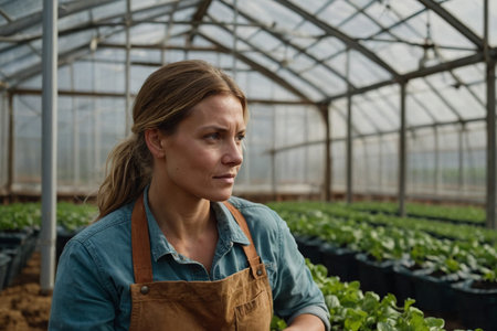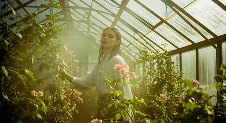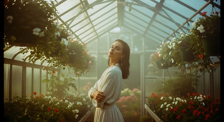 A serene woman standing in a beautiful greenhouse surrounded by vibrant flowers
