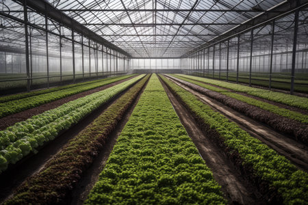 A remarkable scene of a large indoor greenhouse with rows of lettuce plants growing in the ground and fog coming through the glass roof.. Generative Ai