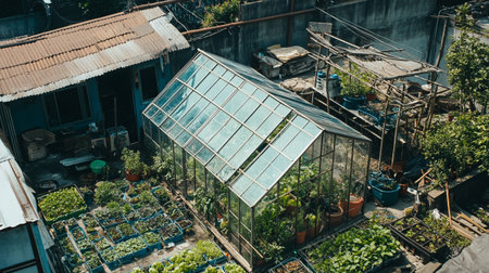 Aerial view of vegetable garden and greenhouse in Bangkok, Thailand.