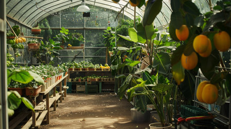 Greenhouse Interior Filled With Lush Plants And Ripe Citrus Fruits In Afternoon Light