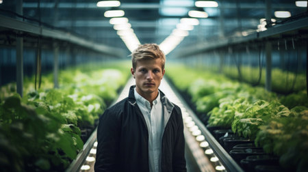 A proud man standing in a greenhouse with lots of plants. AI generative image.