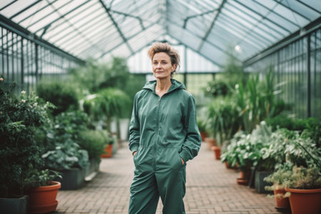 A confident woman standing in a beautiful greenhouse surrounded by lush greenery and vibrant flowers.