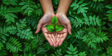 A vibrant scene showcases diverse figures holding hands around a sprouting plant, symbolizing unity and environmental care in a lush natural setting.