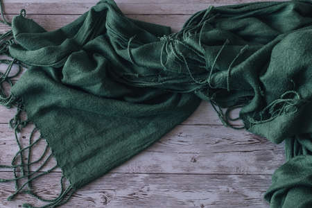 soft green cloth scarf with bangs on wooden board