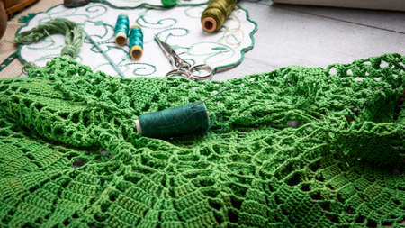 Set of sewing and embroidery supplies on a table: sewing thread, embroidered doiles, scissors