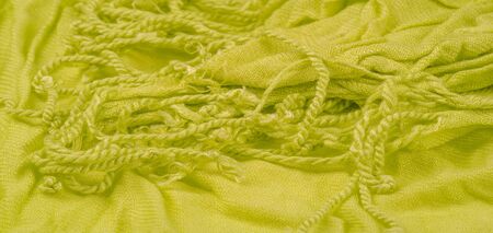 Green silk shawl with fringe at the edge of the fabric. This is a common type of tie. Warm green on a white background. Template