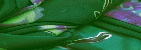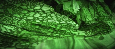 Texture, background, design, fabric, green silk with a floral pattern. Fragment of colorful retro silk textile pattern with floral ornament as background