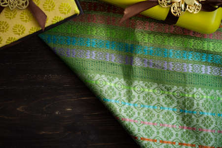 Autumn theme background, old wooden vintage desk boards, with plaid top view copy space for text banner
