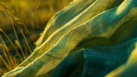 A rich, green fabric flows elegantly on a warm, textured surface during golden hour. The sun casts a soft glow, enhancing the fabric's vibrant color and inviting warmth.