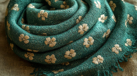 A cascade of emerald-hued silk draped with intricate floral embroidery, forming graceful folds that reflect light in gentle waves and evoke refined luxury, exuding classic charm