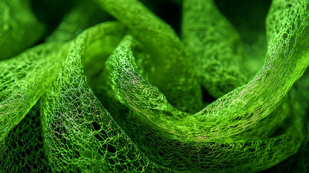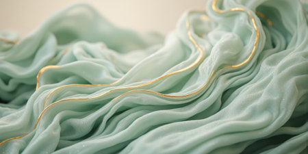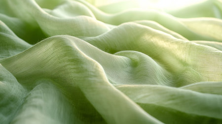 Close-up of soft green fabric with light textures, illuminated by gentle sunlight, creating a wavy and airy abstract scene.