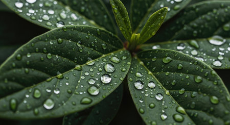 This image showcases a close-up of a plant's leaves covered in water droplets. The leaves display a rich green hue, with visible veins and textures. The composition is likely captured outdoors, possibly after rainfall or in a humid environment. This visual is suitable for various commercial or editorial applications.