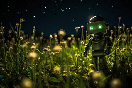 Robot and dandelions in the meadow at night.