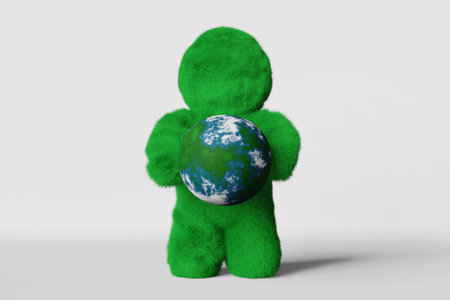 Happy Earth Day card April 22 Cute green grass Yeti blue planet 3d rendering banner. Ecology Environment Ecosystem Saving Conscious consumption. Sustainability Climate change Stop destruction concept.