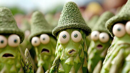 A group of asparagus sprouts with eyes and hats on them, AI