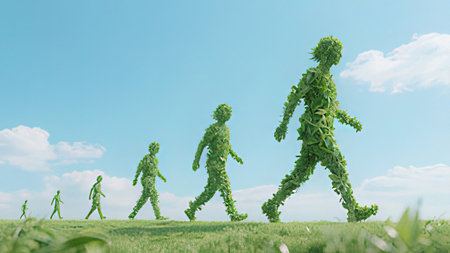 3D render of a group of people running in a green field