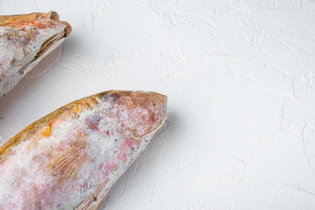 Frozen surmullet fish set, on white stone table background, with copy space for text