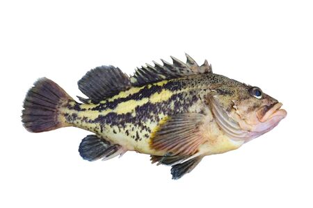 Alive rockfish Sebastes trivittatus (Yellow Rockfish, Gold Rockfish or Three-stripe Rockfish) isolated on white background. Alive fresh raw delicious fish.