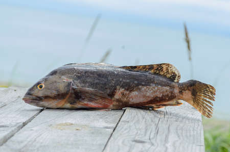Bass fishing. Large sea bass terpug on a table made of rough wooden planks on the beach. Selective focus.