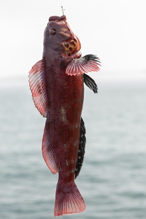 Mackerel on the hook. Bottom sea fishing in the Pacific near Kamchatka.