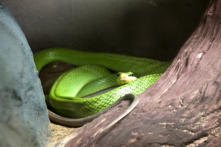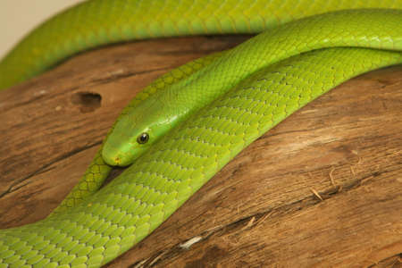 Green mamba snake laying on a dead tree stump