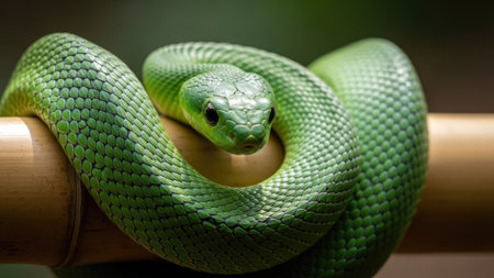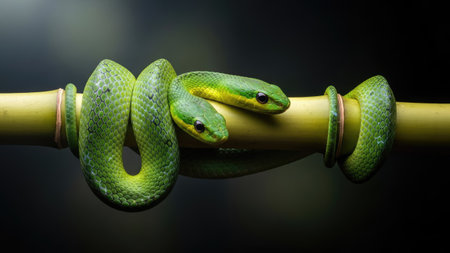 A vivid green snake is coiled around a bamboo branch, its scales catching the light. The image showcases the snake against a deep black backdrop, emphasizing its vibrant color. The composition suggests an isolated environment, suitable for various editorial and commercial applications. The close-up perspective highlights the texture and detail.