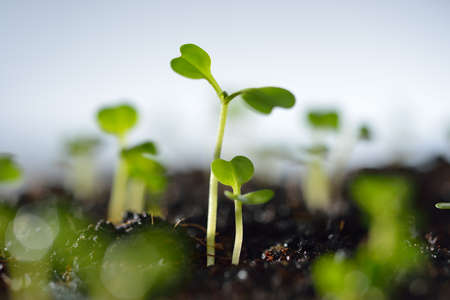 Seeds sprout from the ground. Young seeds are drawn towards the light. Germination of seedlings. Green stems emerged from the seed.