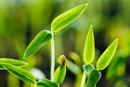 Growing microgreens with seed leaf or cotyledon on green bokeh background