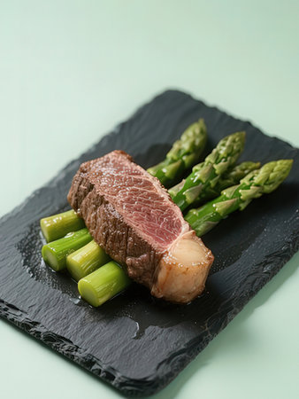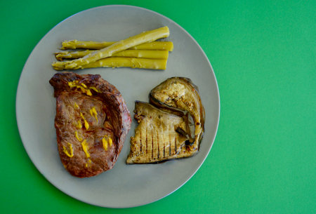 Grilled beef steak with asparagus and yellow mustard on a green background