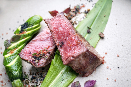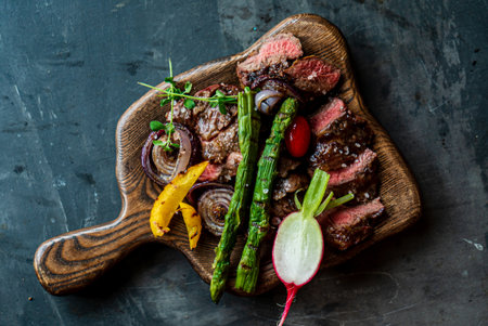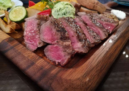 sliced grilled stake with vegetables on a wooden board. High quality photo