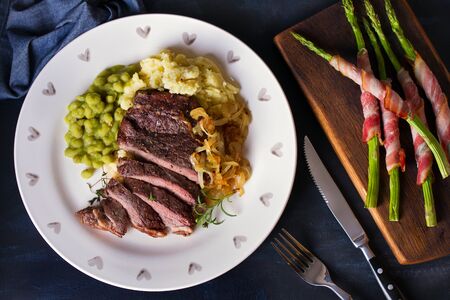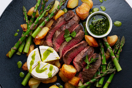Sliced steak with asparagus and potatoes, brie and green sauce