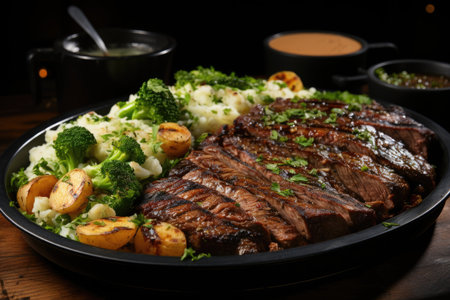 Succulent grilled picanha surrounded by colorful side dishes., generative AI