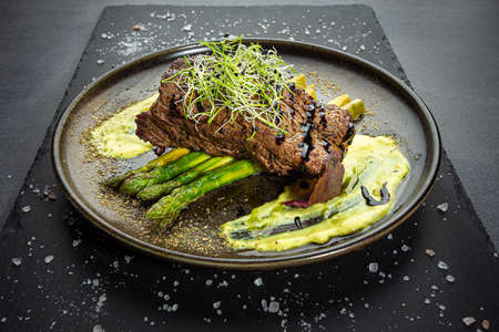 Meat with potatoes and asparagus on a white plate. The Restaurant
