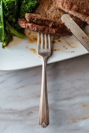 Stock Photo - Ribeye steak with vegetable dressing on a white plate