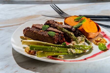 Well done sliced beef rib boneless club steak with parmesan garlic asparagus and baked sweet potatoes plated with raspberry walnut
