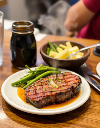 Steak with vegetables on a white plate in a restaurant. Restaurant