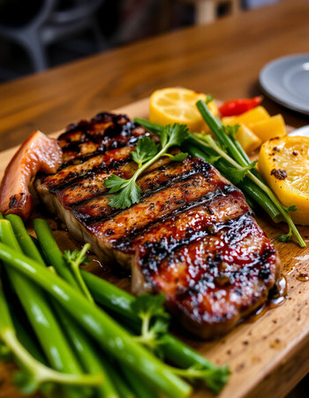 Grilled pork chop with vegetables on a wooden board in a restaurant