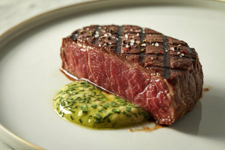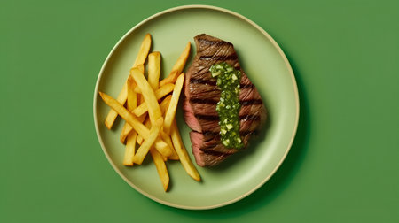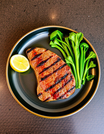 top view of a perfectly grilled steak on a plate, created with generative ai