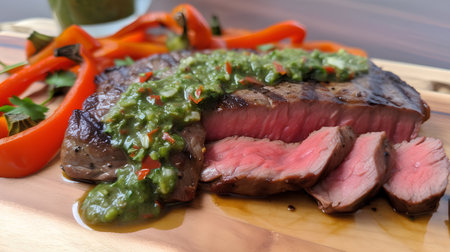 Succulent marbled steak rests on a wooden cutting board, adorned with vibrant herbs and spices, showing rich colors and textures in dramatic lighting.