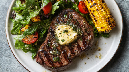 A delicious grilled steak served with fresh salad and roasted corn. Perfect for summer meals, this dish showcases vibrant colors and flavors.