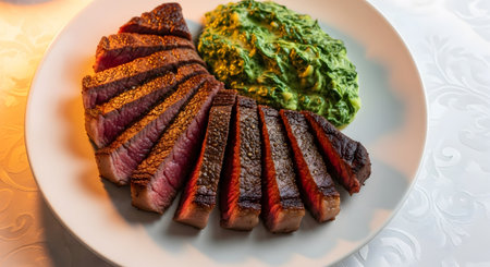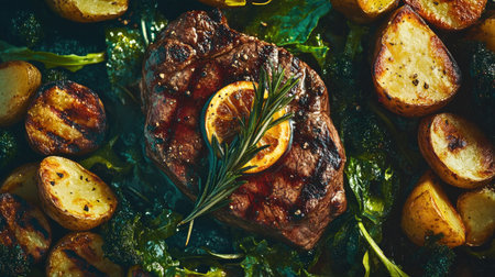 A beautifully arranged plate featuring grilled steak, garnished with fresh herbs and lemon, presenting an appetizing culinary delight.