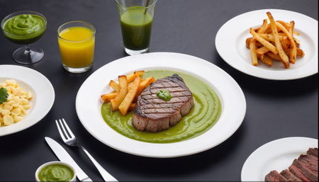 A close-up view displays a grilled steak, fries, and broccoli on a white plate with a sauce. The food is arranged neatly, with a rich color palette. The composition has soft lighting that suggests an indoor setting. This image could be used for culinary, restaurant, or food-related marketing material.