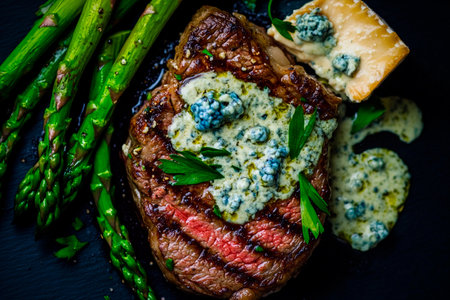 A perfectly grilled steak rests on a dark plate, lavishly topped with creamy blue cheese sauce. Tender asparagus spears complement the dish, creating a mouthwatering culinary experience.