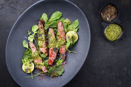 Sliced beef steak with sauce. On stone board. Top view flat lay