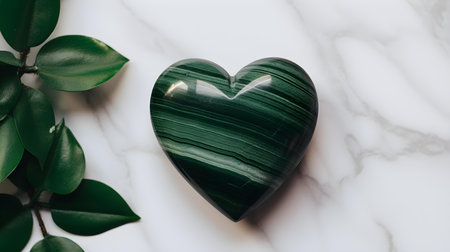 Top view of a dark green heart on a white marble background. Romantic backdrop with copy space