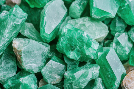Cluster of uncut emerald gemstones on a dark surface highlighting vibrant green color and raw beauty of precious stones in a close-up view of jewelry and minerals