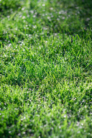 Close-up detailed background of fresh green bright grass on sunny summer day. Beautifully mowed lawn. Nice rest area.