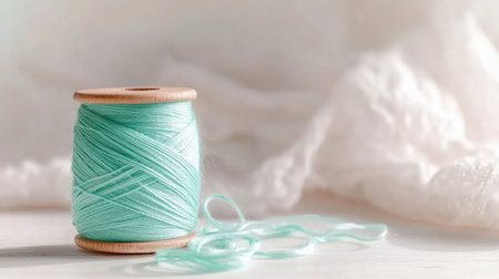 A beautiful mint green thread on a wooden spool creates a serene scene. The soft pastel color and delicate background evoke creativity and inspiration for crafting projects.