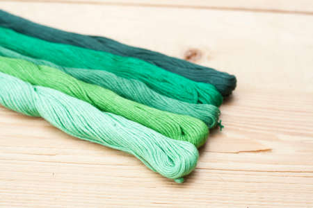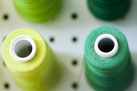 Photo of threads in different shades of green on green background