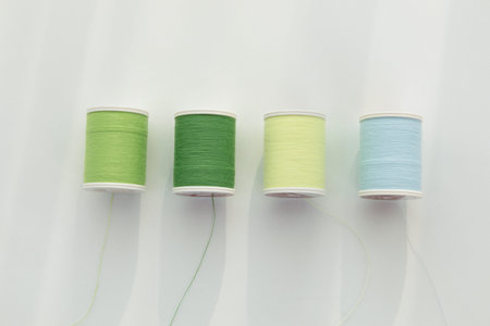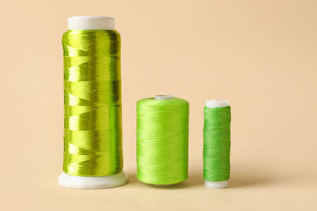 Green sewing thread spools on light background